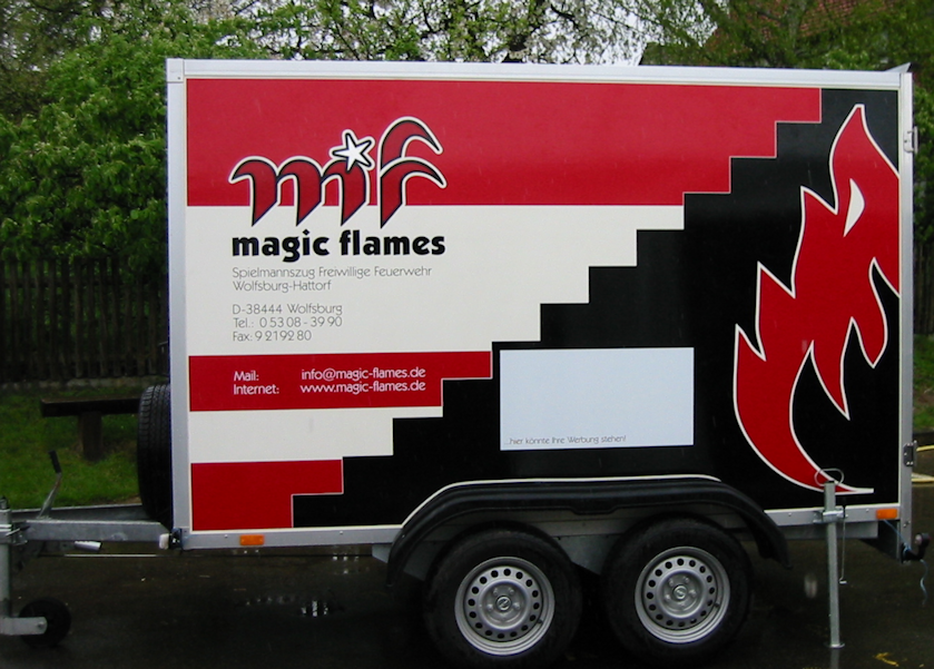 Ein besonderes Highlight gab es zum Abschluss der Veranstaltung: Michael Sothmann, Leiter des Geschäftsbereiches Bürgerdienste, übergab im Namen der Stadt Wolfsburg einen Instrumentenanhänger an Ortsbrandmeister Stefan Brandes und Spielmannszugleiter Lars Schmidt. Mit diesem werden künftig Instrumente und Ausrüstung zu den Auftritten transportiert. Natürlich ist auf dem Anhänger auch der neue Name „magic flames“ mit dem neuen Logo zu sehen. Darüber hinaus wurde das Aussehen des Anhängers an das Zugfahrzeug, den VW-Bus der Feuerwehr, angepasst.