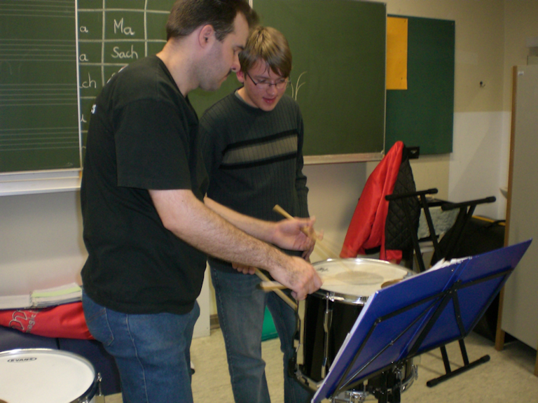 Wer Lust hatte, konnte unter Anleitung der Musiker die Flöten, Schlaginstrumente und das Xylophon ausprobieren. Vor allem im Schlagzeugbereich war das Interesse nicht nur bei den jungen Besuchern sehr groß, sondern auch musikinteressierte Jugendliche konnten sich an den verschiedenen Trommeln und Rhythmusinstrumenten ausprobieren und selbst erfahren, dass Musik im Spielmannszug durchaus modern und „cool“ sein kann.