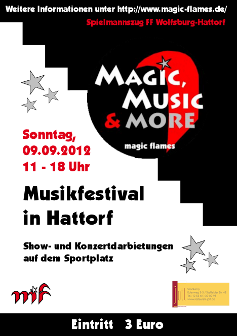 Anlässlich unseres 45jährigen Bestehens präsentieren wir Konzert- und Show-Darbietungen von 12 Musikzügen mit unterschiedlichen Instrumentenbesetzungen und Stilrichtungen. Teilnehmer aus Hamburg, Schleswig-Holstein und Niedersachsen zeigen am 9.9. ein abwechselungsreiches Musikprogramm auf dem Hattorfer Sportplatz. |